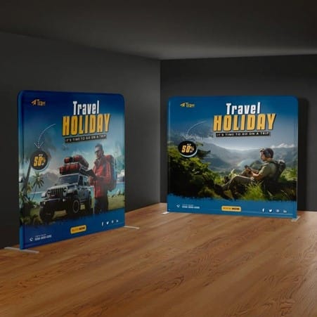 Now let’s stroll into the softer side of displays. Stretch Fabric Media Walls. These things look good in photos, look good in person, and look even better when you are standing in front of them pretending to be on a red carpet.
